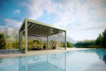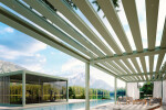 Carrera is the bioclimatic pergola with alternate fixed and movable blades, which lift and overlap one another, thus creating a pleasing alternation of light and shadow. Custom-made, Carrera can be equipped with Glass Series glazing, LED lighting and modular platforms; furthermore, the fixed blades make possible the installation of hanging elements and Mod-Lines.