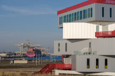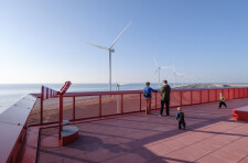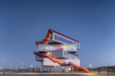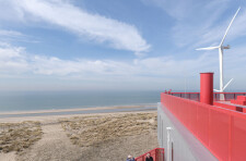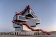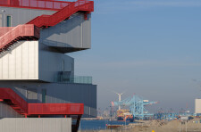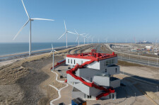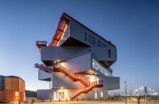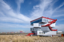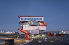 Comprising a stack of five rotated storeys and a winding red public staircase, Portlantis stands out amidst the grassy dunes. On its different levels, the building offers views across the North Sea, coastline, and port. When viewed from afar, Portlantis appears like a beacon. MVRDV designed a structure that adopts a practical approach to its educational role. The building’s simple functionality, dramatic presence, and industrial materials channel the spirit of the port.