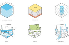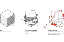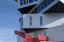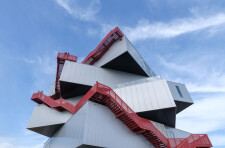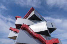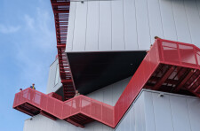 The building’s exterior features platforms on each level, created by the different orientations of the stacked floors. These platforms are connected by the red staircase (designed with a gentle incline) that winds its way upwards, leading visitors to a freely accessible panoramic deck. Portlantis therefore acts as an observation tower as well as an exhibition space.