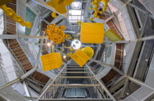 The building includes a 22-metre-high atrium at its centre, where a hanging kinetic sculpture is visible on every level and a model of the Port of Rotterdam welcomes visitors on the ground floor.