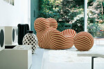 Designed in 1969, from the onset the Up series has been one of the most outstanding expressions of design with its expressive shapes upholstered with elastic fabric. The seven items that form it include the armchair and pouf UP5-UP6, icon of modernity, metaphor of the female figure that is endowed with a comfortable womb and is yet a prisoner. And again, the “foot” UP7, bject-sculpture, out of scale archaeological fragment, redesigned with modern technology.